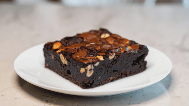 Chocolate balls falling onto a tower of chocolate pieces piled on a plate