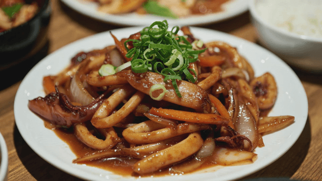 Spicy stir-fried squid on a plate