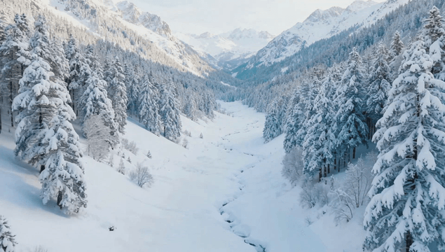 Snow-covered mountains and forests
