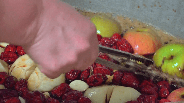Adding fruit to a pot with soy sauce