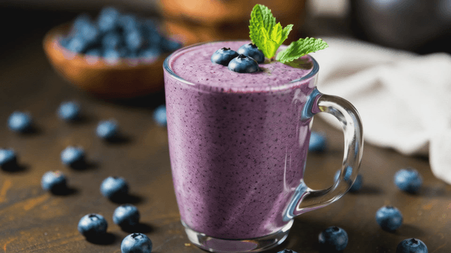 Purple blueberry smoothie on table