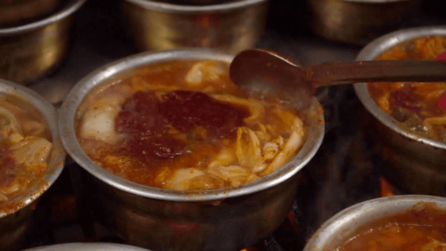 Stirring the hearty mustard leaf kimchi stew boiling in a pot with a ladle