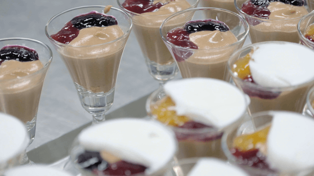 Rows of elegant dessert glasses on trays