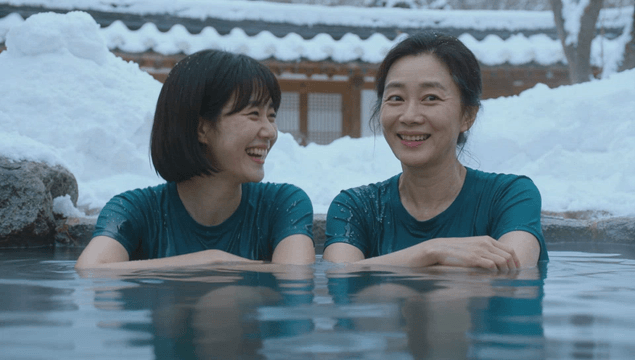 Mother and daughter enjoying a winter hanok hot spring