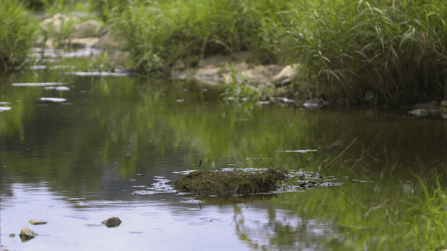 A tranquil stream flowing through lush greenery