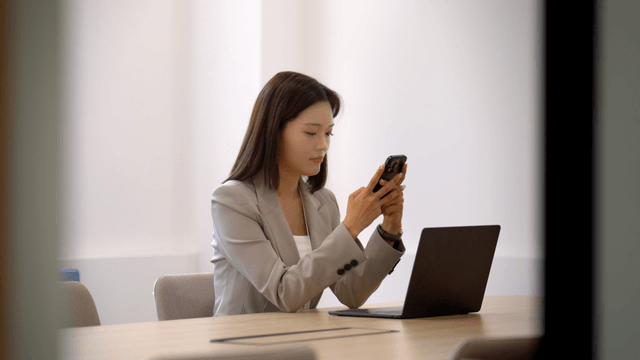 Woman drinking coffee and looking at her phone while working on her laptop at home