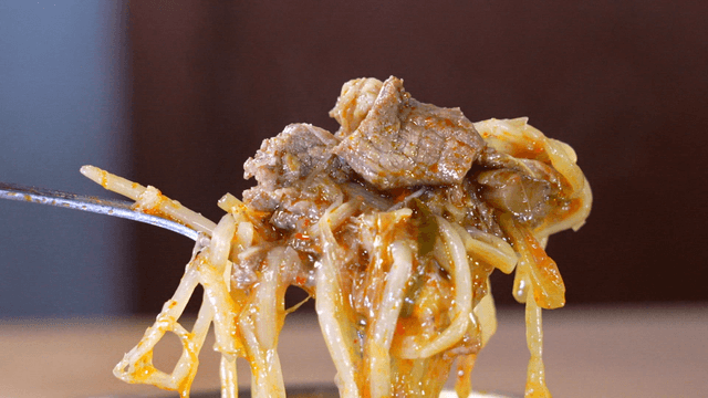 Korean beef soup filled with meat in spoon