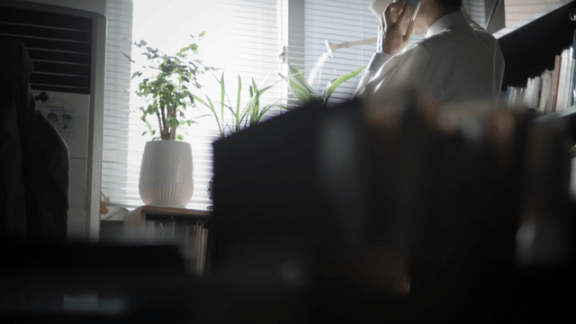 Person talking on the phone in a cluttered room