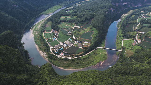 Aerial View of Serene Donggang River Meandering Through Lush Landscape
