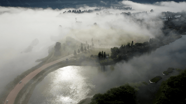 Quiet river landscape shrouded in fog.