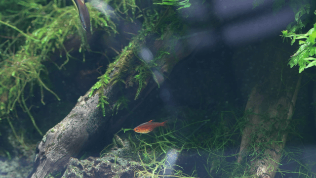 Small fish swimming in lush aquarium