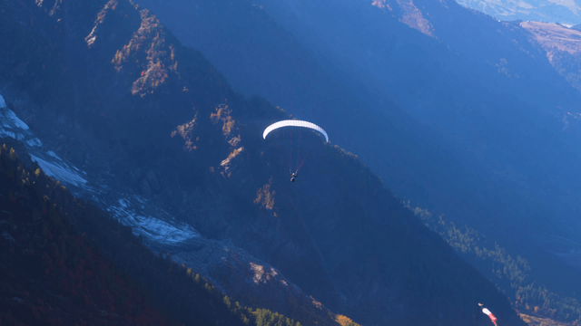 Paraglider soaring over a mountain landscape