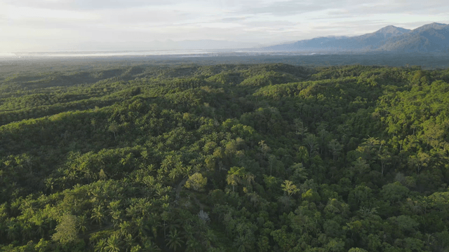 Lush green forest with distant mountains