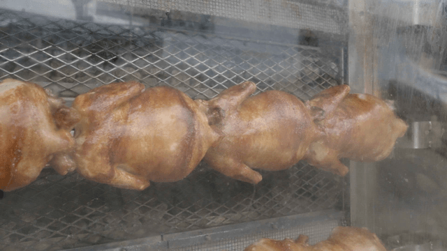 Rotisserie chicken roasting on a spit