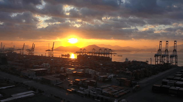 Sunset over a busy cargo port
