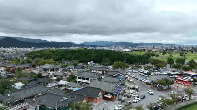 Aerial view of historic Hanok and lake
