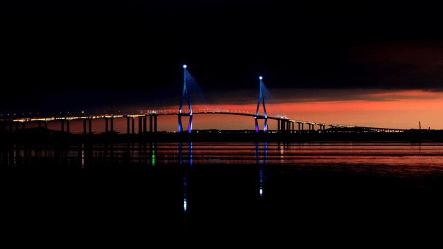 Sunset in Yeosu with a view of Dolsandaegyo Bridge over the sea
