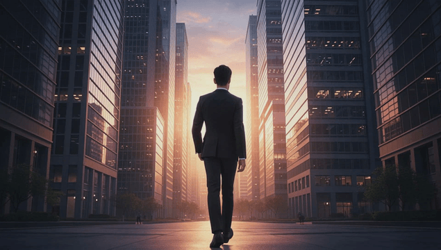 Back of an office worker walking down a street between buildings at sunrise