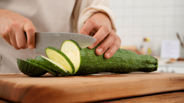 Slicing a zucchini on a wooden board