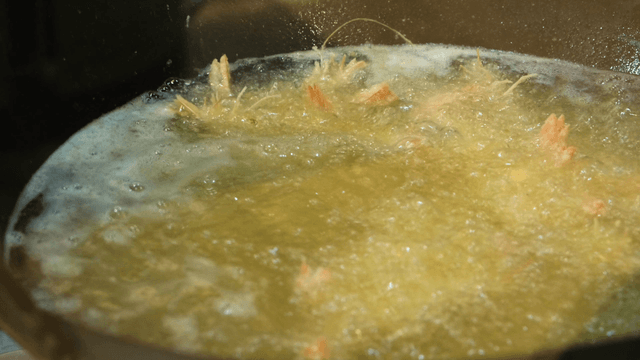 Shrimp being deep-fried in hot oil