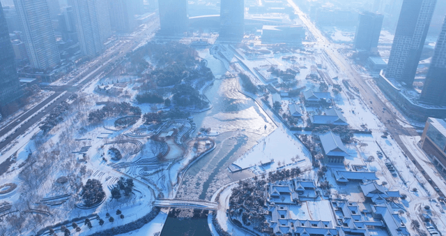 Snow-covered cityscape with modern buildings