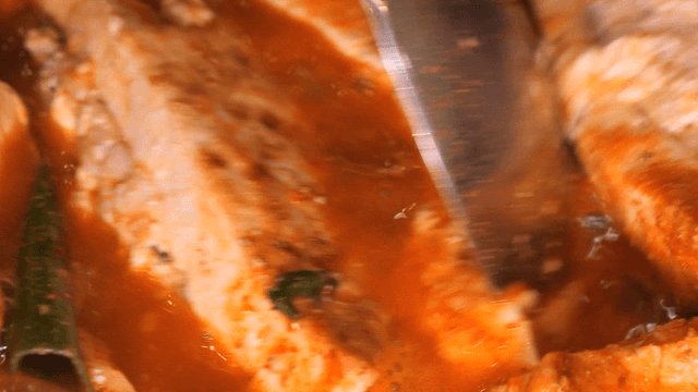 Close-up of a simmering pot of spicy stew with vegetables and abalone