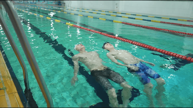 Two men practicing swimming in a pool