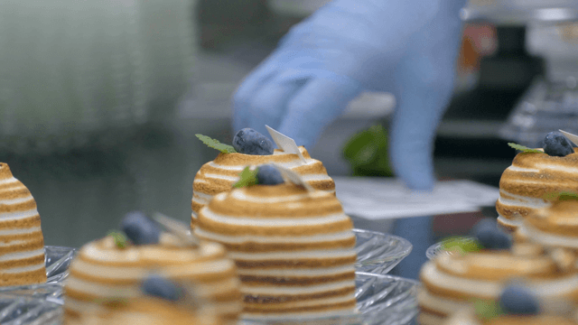 Chef decorating desserts with blueberries