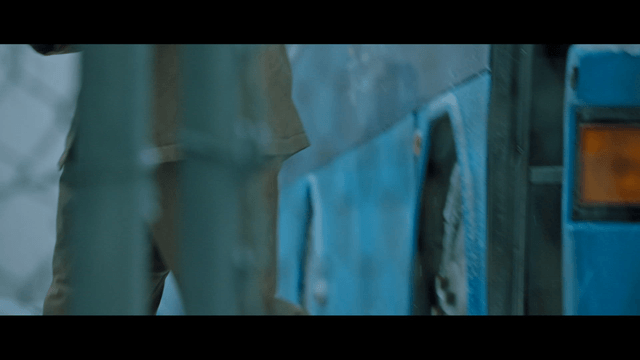 Prisoner in turquoise clothes coming down stairs