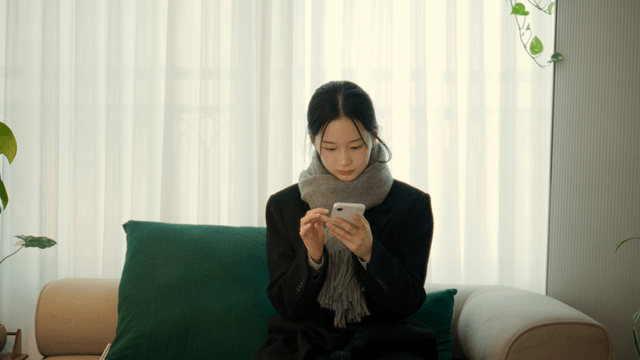Woman using smartphone on a cozy sofa