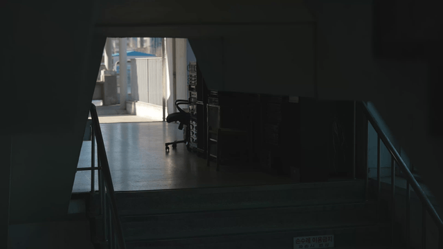 A quiet tunnel leading to outdoor stairs