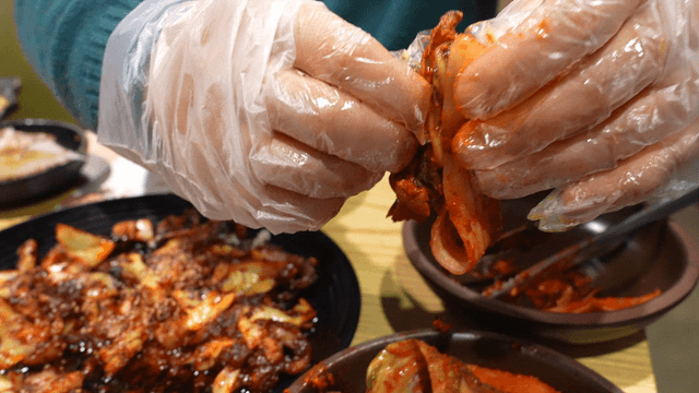 Person picking up traditional kimchi with plastic gloved hands