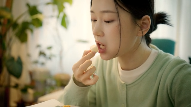 Woman eating cup ramen with lid on at home