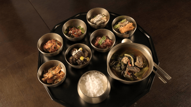 Variety of Korean Traditional Dishes Served in Traditional Metal Bowls