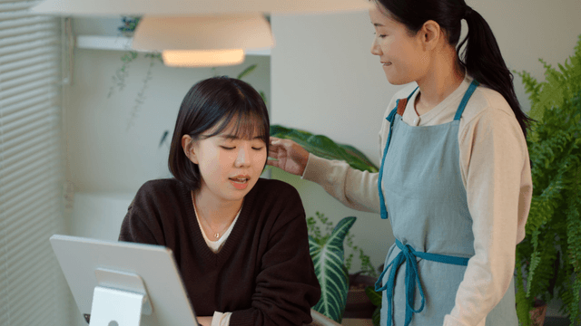 Mother looking at her daughter using her smartphone with pitiful expression.