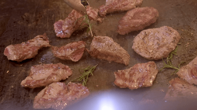 Grilling a large piece of meat on a barbecue grill with tongs outdoors