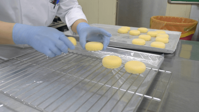Chef removing cooked starch batter from a tray