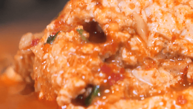 Spoonful of spicy pork stew with tofu simmering