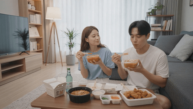 Couple eating delivery food at home