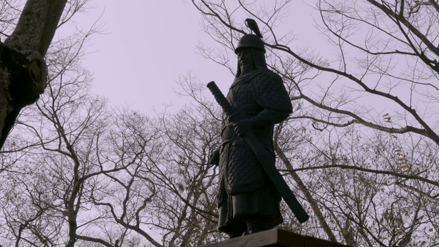 Statue of a warrior among bare trees