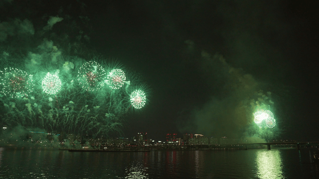 Spectacular Fireworks over the Cityscape and River at Night