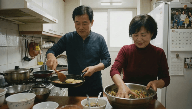 Family cooking Korean pancakes together