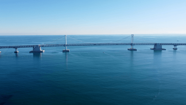 Vehicles crossing a Gwangan Bridge over the calm sea on a clear day