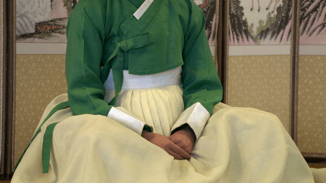 People wearing traditional Korean clothing, Hanbok, walking along a mountain path in a dense forest