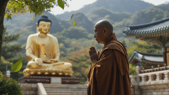 Monk in a temple with a golden Buddha statue