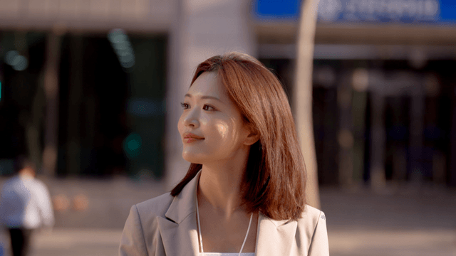 Smiling office worker leaves the building with a happy expression