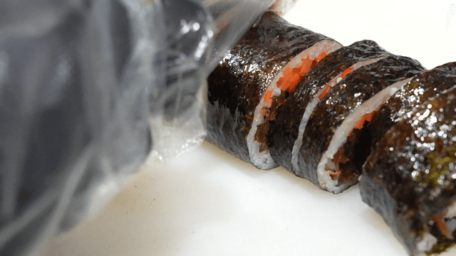 Slicing kimbap with a sharp knife