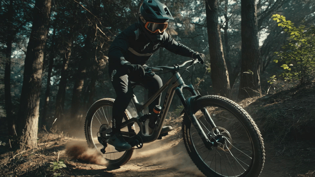 Mountain biker racing through a forest trail