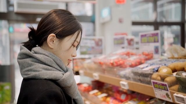 Woman shopping carefully at grocery store