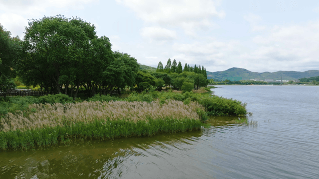 Serene riverside with lush greenery